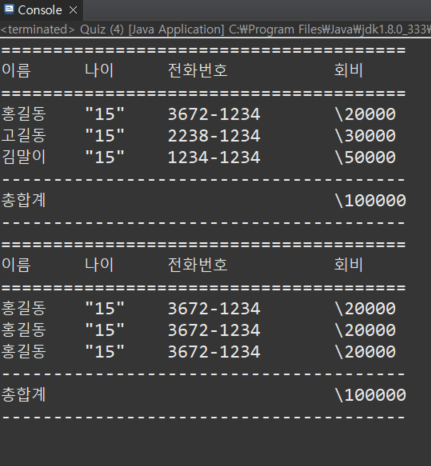System.out.println("이름\t나이\t전화번호\t\t회비");