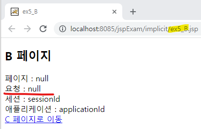 'ex5_A.'파일에서는 request.getRequestDispatcher("ex5_B.jsp").forward(request, response); 코드에 따라