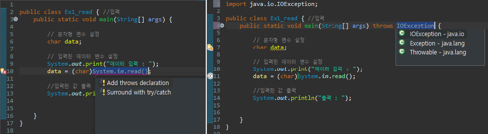 그러면 main 함수에 자동으로 'throws IOException'이 추가되고 import 선택하라고 뜬다.
