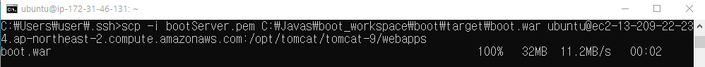 scp -i bootServer.pem C:\Javas\boot_workspace\boot\target\boot.war ubuntu@ec2-13-209-98-174.ap-northeast-2.compute.amazonaws.com:/opt/tomcat/tomcat-9/webapps