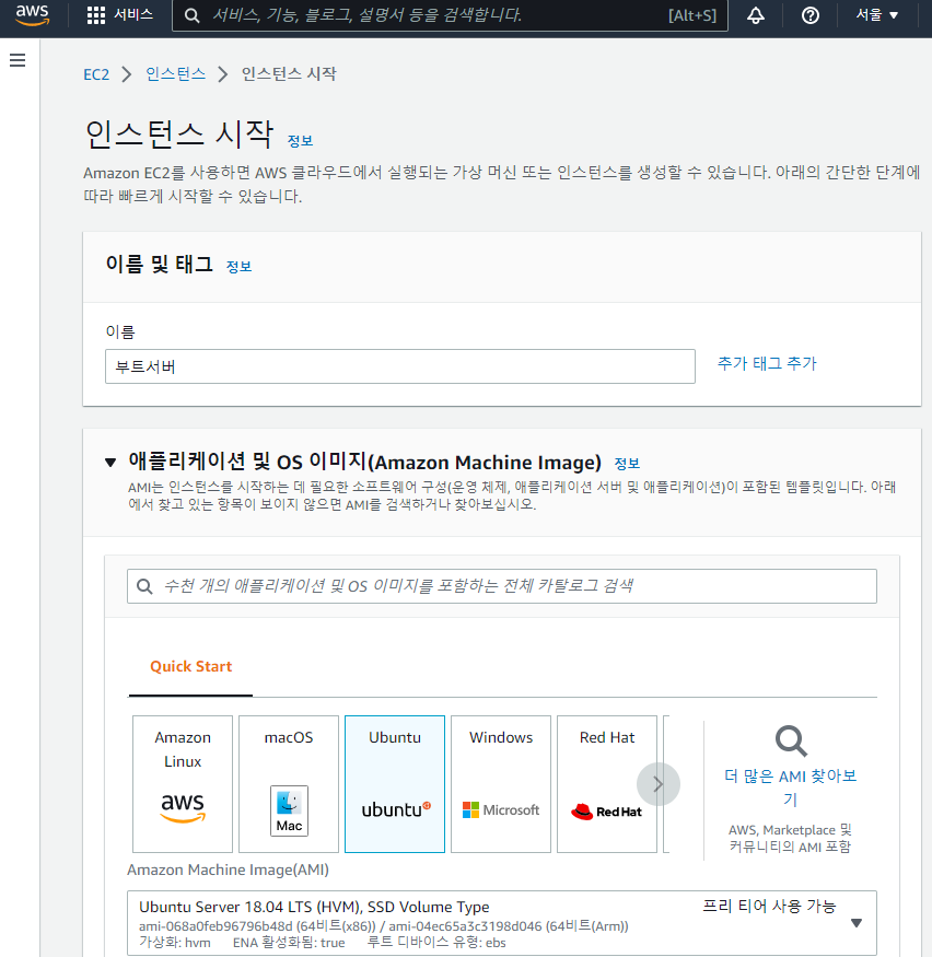 AMI : 우븐트(Ubuntu), Ubuntu Server 18.04 LTS (HVM), SSD Volume Type(프리티어 사용가능) 선택