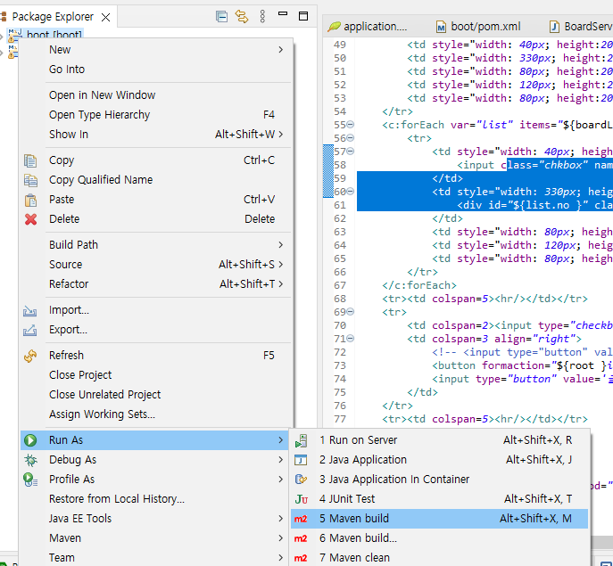 > 원하는 프로젝트 우클릭하여 [ Run As ] > [ Maven build ] 클릭하여 패키징