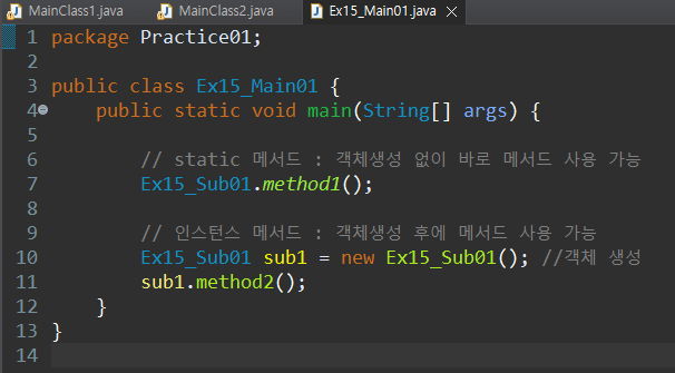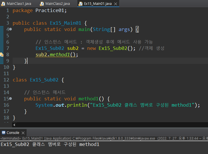 - 나머지 한개의 클래스 파일에는 만든 메서드를 실행하기 위해 메인함수에 객체생성