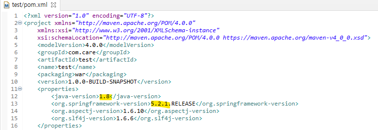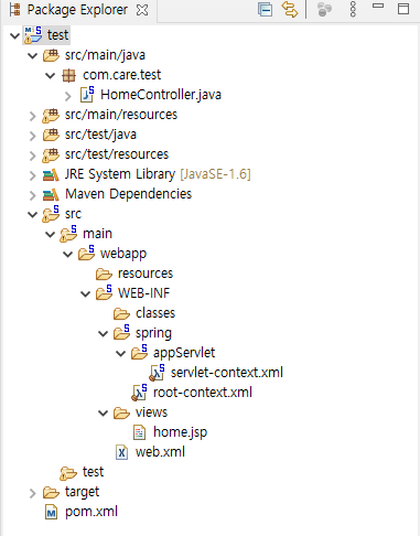 | src/main/java | DAO와 DTO 형태의 JAVA파일들(controller, service 등)을 작성해준다. 하위에 패키지명들은 초기 설정한 com.care.test 명과 동일해야 해당 하위 java 파일들이 스프링에서 인식하여 작동된다.(유효한 파일은 s가 붙는 것을 볼 수 있다) |